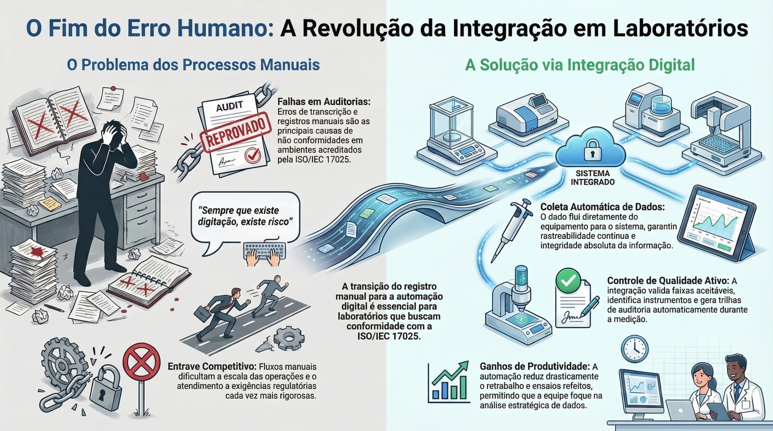A redução de erros humanos tem impulsionado a adoção de sistemas integrados em laboratórios de calibração e metrologia. Estudos internacionais apontam que falhas de transcrição e registros manuais seguem entre as principais causas de não conformidades em auditorias, sobretudo em ambientes acreditados pela ISO/IEC 17025, norma que estabelece critérios de competência e confiabilidade dos resultados.